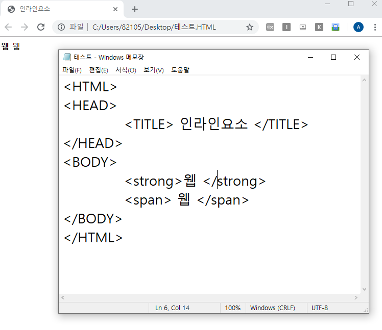 마크업에서 했던 <strong>과 <span> 요소들은 인라인 성질을 가지고 있어 행이 바뀌지 않고 한줄로 출력이 된다.
