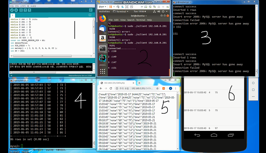 1(아두이노) → 2(VMWARE,우분투,클라이언트) → 3(라즈베리파이,서버) →