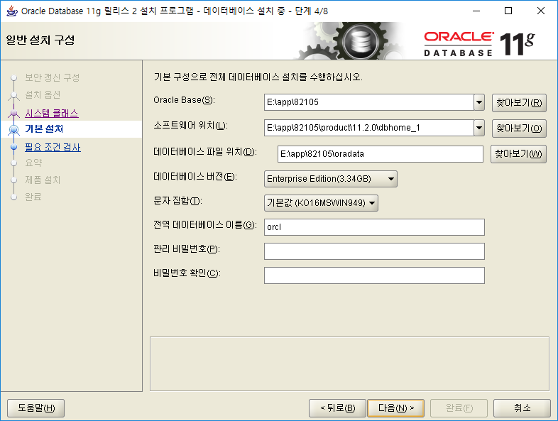 이런 화면이 뜨게 되는데 oracle base란 부분이 이제 파일을 설치를 부분이 되겠다.